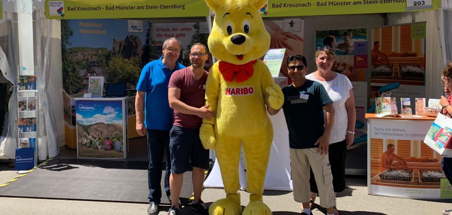 Gut vertreten war die Stadt Bad Kreuznach auf dem Rheinland-Pfalz-Tag im pfälzischen Annweiler (am Trifels). Drei Tage lang informierte der Infostand der Gesundheit und Tourismus für Bad Kreuznach GmbH und Bad GmbH über die Angebote von Bad Kreuznach. Zufrieden war man mit der Resonanz trotz der Hitze vor allem am Samstag. Beim Festzug warb die Stadt diesmal für das Museum für PuppentheaterKultur (PuK). Ein Walking Act mit Corinna Ramona und Katharina Klein – Puppe auf Stelze führt Marionette. Trotz 39 Grad im Schatten gab es viel Szenenapplaus vom bezauberten Publikum, mit dem die kleine Marionette stets den Kontakt suchte. Es assistierten (vor allem für Trinkwassersversorgung) den Künstlerinnen im Zug: Bettina Eckes und Frau Cscherbak vom PuK und Michael Vesper von der GuT.