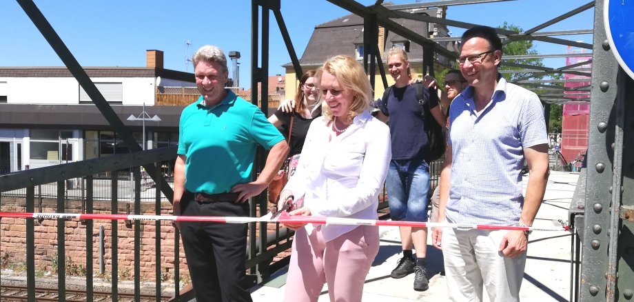 Foto: Freuen sich, dass der Löwensteg nun wieder nutzbar ist: OB Dr. Heike Kaster-Meurer, Bauamtsleiter Klaus Christ (links) und Tiefbau-Abteilungsleiter Hans Sifft eröffneten mit Fußgängern am Freitagmittag offiziell die ertüchtigte Fußgängerbrücke.