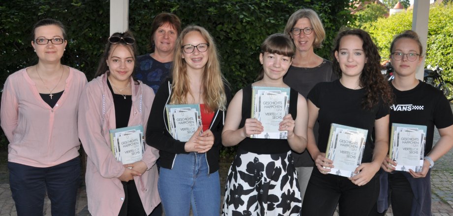 Die Lehrerinnen und die Schülerinnen bedankten sich bei Franziska Blum-Gabelmann, die bei deren Besuchen im Stadtarchiv helfen zur Seite stand. Außerdem gilt der Dank auch Tom Weinmann (9a), Sprecher im Hörspiel und Paul Gänssmantel (9a), technische Betreuung.
