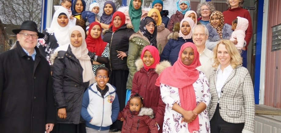 15 somalische Frauen haben den Mietführerschein bestanden. Das Angebot aus dem Projekt „Aktiv für Flüchtlinge“ wurde erstmals von der Gewobau gesponsert. Oberbürgermeisterin Dr. Heike Kaster-Meurer (rechts, vorn) und der Geschäftsführer der Gewobau, Karl-Heinz Seeger, gratulierten den Teilnehmerinnen.
