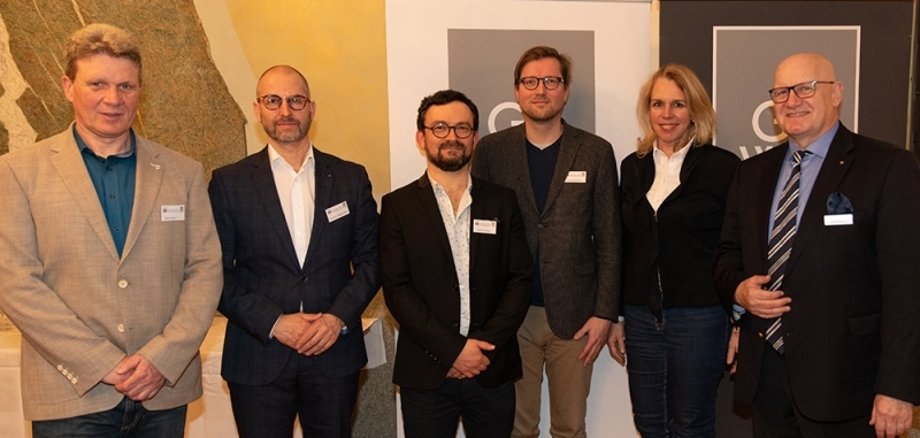 Referenten und Gastgeber der Veranstaltung „Alles andere als Platte“: Stadtbauamtsleiter Klaus Christ, Prof. Dr. Stephan Ruhl von der Hochschule Mainz, Architekt Thomas Kruppa aus Luxemburg, Referent Frederik Ruhrort vom Verband der Wohnungswirtschaft Rheinland-Westfalen, Oberbürgermeisterin Dr. Heike Kaster-Meurer und der Geschäftsführer der Gewobau, Karl-Heinz Seeger.