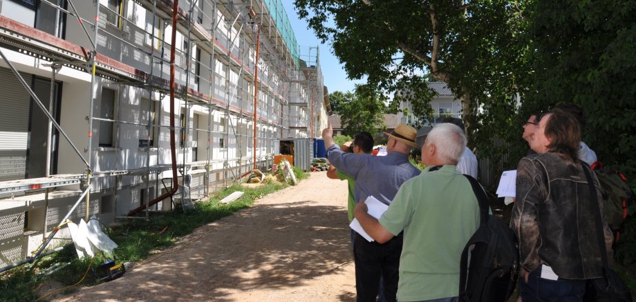 Foto: Neu Balkone für die Schubertstraße 6-8: Im Juni 2018 machten sich Oberbürgermeisterin und Aufsichtsratsvorsitzende Dr. Heike Kaster-Meurer und Gewobau-Geschäftsführer Karl-Heinz Seeger mit Vertretern der Presse ein Bild von den Modernisierungsarbeiten.