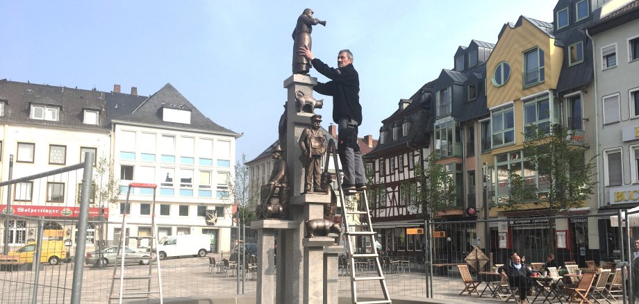 Die Figuren aus einem Bronzeguss (Messing-Kupfer-Zinn-Legierung) wurden in der schwäbischen Kunstgießerei Strassacker in Süßen von Patina und Schmutz gesäubert, gesandet und neu patiniert. Wie frisch gegossen und in der Maisonne strahlend stehen sie seit Donnerstagmorgen auf dem neuen Brunnenaufsatz, fünf Sockelstehlen aus Naturstein. Die Stelen wurden zusammen mit der Bodengranitplatte des Brunnens von dem Bad Kreuznacher Steinmetz- und Bildhauerarbeitenbetrieb Bussmer & Orben hergestellt, da die alten zu porös geworden waren. Insgesamt kostete die Sanierung der Originalefiguren rund 14.500 Euro.