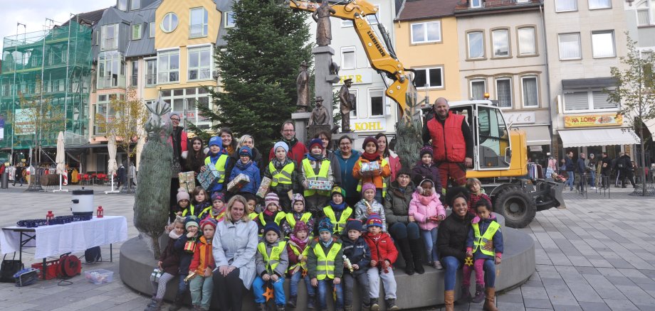Aufgestellt wurde der Baum neben dem Originale-Brunnen von den fleißigen Händen der Bauhofmitarbeiter. Die Mädchen und Jungen der Kita Pappelweg, der Evangelischen Kita Pauluskirche und dem Kinderhaus Matthäus schmückten ihn anschließend mit selbstgebastelten Papiersternen und Geschenkpäckchen. Zusammen mit ihren Erzieherinnen holten sie sich außerdem ihre Tannenbäume oder -zweige ab. Wer nicht kommen konnte, oder wem der Weg in die Innenstadt zu weit war, der kann sich seinen Baum zu einem späteren Zeitpunkt auf der Pfingstwiese besorgen.
