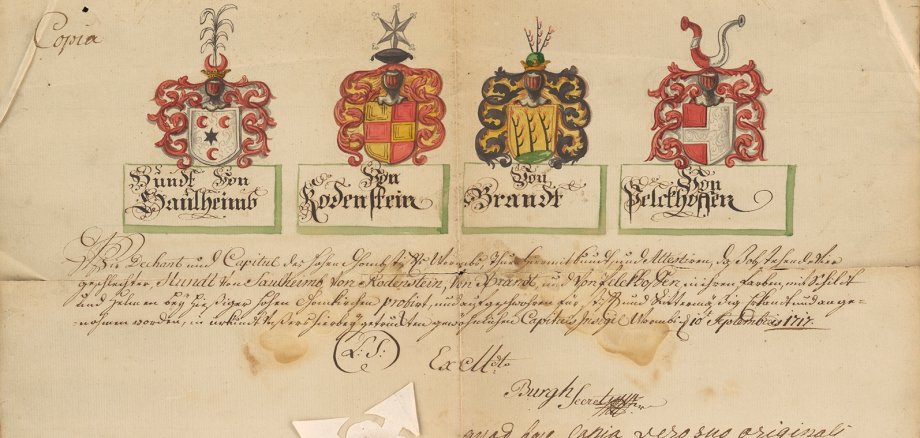 Die 1717 in Worms ausgestellte Kopie eines Attestats ist Teil einer kleinen Sammlung des Stadtarchivs Bad Kreuznach. Darauf sind die Wappen der Adelsfamilien Hund von Saulheim, von Rodenstein, von Brandt und von Pelckhofen zu erkennen. Helm, Helmzier, Helmdecken, Schild sowie Helmkrone (Hundt von Saulheim/von Brand) und Kissen (von Rodenstein) wurden per Hand mit stark leuchtenden Tinkturen auf Hadernpapier aufgetragen. Die Farbgebung der Wappen, die sogenannte Tingierung, bringt den gewünschten Kontrastreichtum zum Ausdruck, der ursprünglich für ein schnelles Erkennen von heraldischen Zeichen notwendig war. Im Folgenden ist der Inhalt des Attestats wörtliche widergegeben: