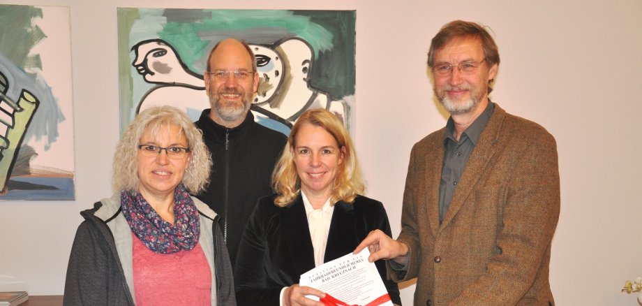 Foto: 1164 Unterschriften und ein Schutzengel für mehr Sicherheit im Straßenverkehr: OB Dr. Heike Kaster-Meurer nimmt die „Petition für ein fahrradfreundlicheres Bad Kreuznach“ von Pfarrer Dr. Claus Clausen (rechts) zusammen mit Christine Götz und Dr. Stefan Scholvien in Empfang.
