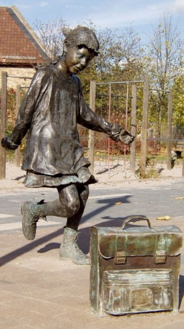 Mit dem auf dem Boden knienden, spielenden Jungen, der in Blickrichtung des Mädchens angebracht wurde, greift Greco bewusst traditionelle Motive auf. Durch das Murmelspiel sollen die Schulkinder zum Spielen mit der Figur animiert werden, so die Absicht ihres Schöpfers. Entstanden ist der Bronzeguss in einer Kunstgießerei in Kalabrien, unter anderem in Zusammenarbeit mit Prof. Cimino Franco von der Accademia di Belle Arti in Catanzaro. Die Bronzeplastik kostete rund 21.000 Euro und wurde durch „Kunst am Bau“ finanziert.