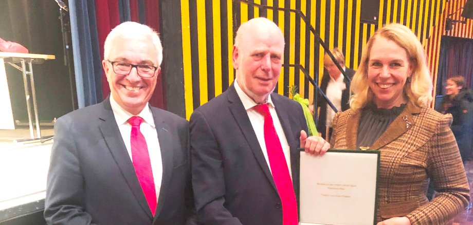 Foto: Stadtrat Carsten Pörksen (Mitte) wurde gestern in Lahnstein von Innenminister Roger Lewentz und OB Dr. Heike Kaster-Meurer mit der Freiherr-vom-Stein-Plakette 2019 geehrt.