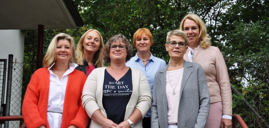 Foto: Danke für die geleistete Arbeit: OB Dr. Heike Kaster-Meurer und Sabine Raab-Zell (Leiterin Amt für Kinder und Jugend, blaue Bluse) mit den Jubilaren (v. l.) Bärbel Weidmann, Andrea Schlevoigt, und Pamela Kleinz sowie Jeannette Casper, die verabschiedet wurde.
