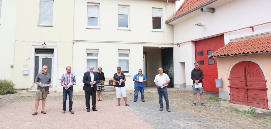 Foto ganz oben: OB Dr. Heike Kaster-Meurer (vierte von links) und Gewobau-Geschäftsführer Karl-Heinz Seeger (dritter von links) stellten bei einem Termin vor Ort Mitgliedern des Ortsbeirats und der Kulturinitiative "Mein schönes Planig e.V." die Planungen vor.