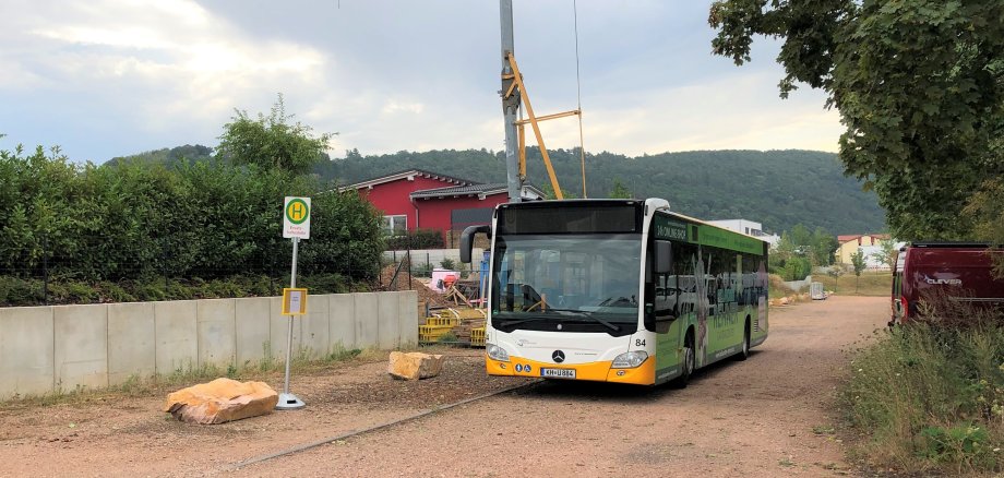 Foto: Ein Bus der Stadtbus GmbH hält probeweise an der neuen Haltestelle für Schüler auf dem Parkplatz am "Rheingrafenblick". Ab Montag kommt er von Montag bis Freitag mehrmals am Tag.