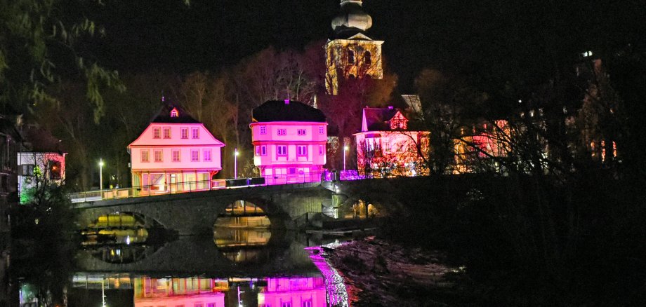 Foto: Die malerischen Brückenhäuser, eines der attraktivsten Wahrzeichen der Stadt Bad Kreuznach, und die Pauluskirche werden im Rahmen einer Aktion der Wirtschaftsförderung von Stadt und Kreis Bad Kreuznach bis in den Januar hinein wirkungsvoll beleuchtet. Foto: KruppPresse