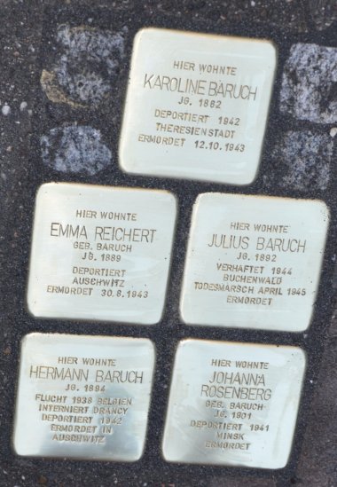 In einer feierlichen Zeremonie setzte der Kölner Künstler Günter Demnig fünf mit Messingtafeln verkleidete Steine in den Bürgersteig vor dem Haus in der Hochstraße 38, in dem Haus, in dem einst die Familie Baruch wohnte. Die Steine tragen die Namen von Karoline Baruch und ihrer vier Kinder Hermann, Julius, Emma und Johanna, die allesamt Opfer der Nationalsozialisten wurden. Die Baruch-Nachfahrin Kerstin Bembenek-Zehmer erinnerte an das Schicksal ihrer Familie.