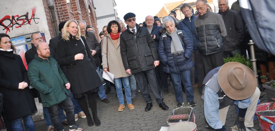 Großes Foto: Bei der Stolpersteinverlegung in der Hochstraße 38 durch Günter Demnig begrüßten Dr. Heike Kaster-Meurer (3. v. l.) und Valeryan Ryvlin (5. v. l.). Über das Schicksal der Baruchs berichtete deren Nachfahrin Kerstin Bembenek-Zehmer (4. v. l.).