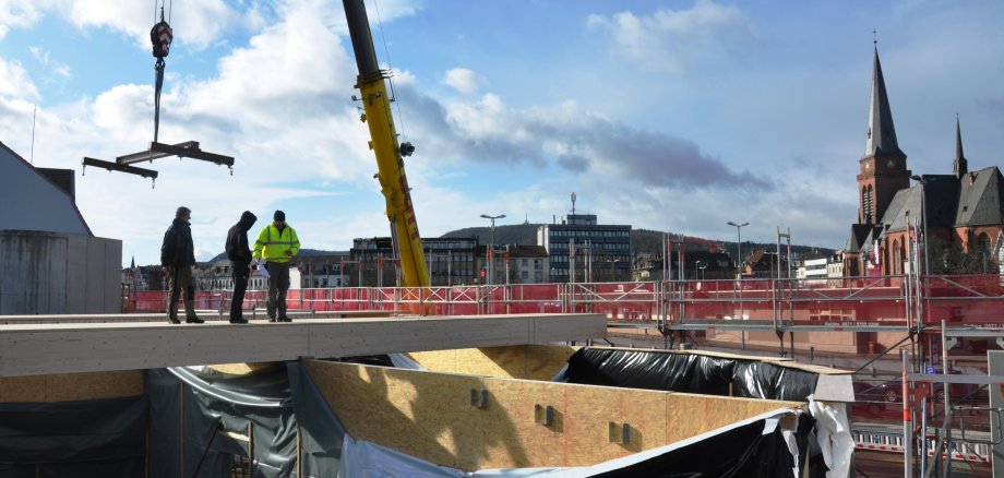 Großes Foto: Mitarbeiter der Firma Holzbau Lehmann aus Bad Kreuznach montieren mit Hilfe eines Autokrans die Deckbalken aus Holz.