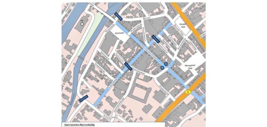 Der Narrenkäfig wird mit 16 Betonsperren gesichert. 16 Mitarbeiter des städtischen Bauhofs (Sachgebiet Straßenunterhaltung) sind schichtweise im Einsatz, um sich um die Absperrungen zu kümmern. Diese stehen in der Rossstraße/Kaiser-Wilhelm-Straße, Mühlenstraße/Beinde, Mannheimer Straße/Römerstraße, Kreuzstraße/Hasengasse sowie an der Kreuzung Kreuzstraße/Hospitalgasse/Turmstraße (siehe Karte oben).