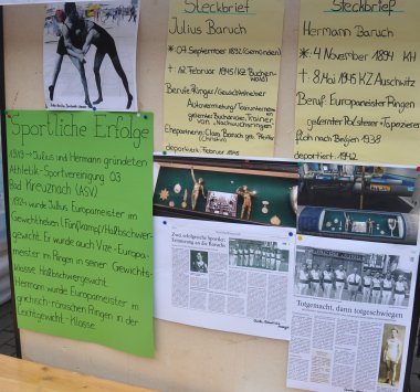 “Wir möchten damit ein Zeichen gegen Ausgrenzung und Diskriminierung setzen”, hatten Celina Neurohr, Lawrencia Apau Adu und Nina Reis (Klasse 10b der IGS) in ihren Flyer geschrieben. Deren Projekt “Stolpersteine” gilt der Familie Baruch, die in der Hochstraße 38 wohnte. Hermann und Julius Baruch waren als Ringer und Gewichtheber sehr erfolgreiche und gefeierte Sportler der Stadt. Sie wurden wie die Mutter Karoline und die Schwestern Emma und Johanna von den Nationalsozialisten ermordet. Zeitungsberichte über das Schicksal der Familie und ein Plakat mit den großen Erfolgen der Gebrüder Baruch hingen an Stellwänden.