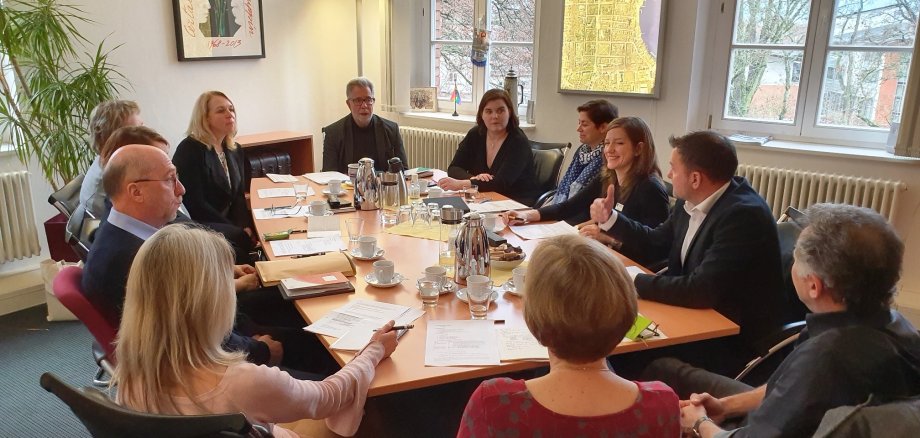 Foto: OB Dr. Heike Kaster-Meurer und Neuruppins Bürgermeister Jan-Peter Golde (Kopfende Tisch hinten) beim Arbeitsgespräch mit weiteren Vertretern der beiden Partnerstädte im Rathaus von Neuruppin.
