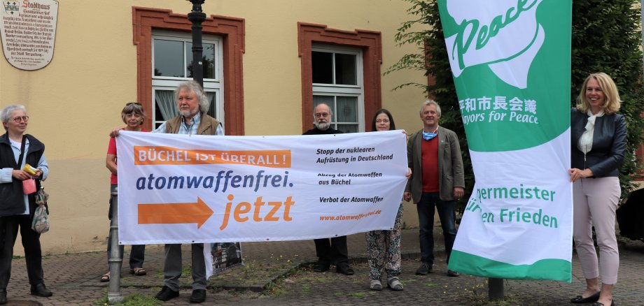 Foto: Hissten vor dem Stadthaus die Flagge von „Mayors for Peace“: OB Dr. Heike Kaster-Meurer (rechts) mit Mitgliedern des lokalen Netzwerks „Aktiv für Frieden Bad Kreuznach“.