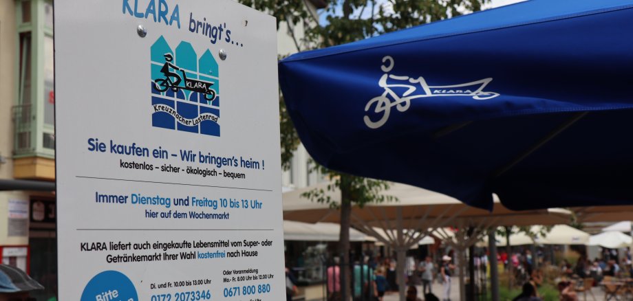Foto: Der KLARA-Stand an der Ecke Mannheimer Straße/Rossstraße auf dem Bad Kreuznacher Wochenmarkt.