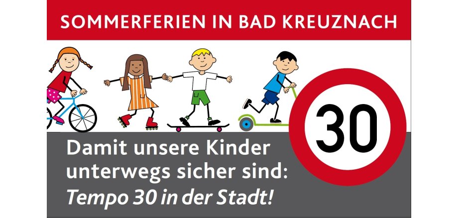 Großes Bild: Mit diesem Schild werden die Autofahrer an den Ortseingängen von Bad Kreuznach freundlich aufgefordert, im Stadtgebiet für die Kinder in den Sommerferien Tempo 30 zu fahren.