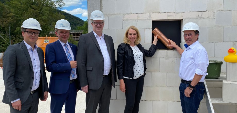 Großes Foto, v. l.: Architekt Sebastian Neuhaus, Stadtwerke-Chef Christoph Nath, Bürgermeister Wolfgang Heinrich, OB Dr. Heike Kaster-Meurer und der Geschäftsführer der Badgesellschaft, Klaus-Dieter Dreesbach, mit der "Zeitkapsel" bei der Grundsteinlegung am Salinenbad.