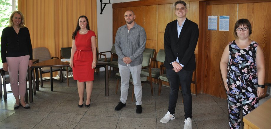 Foto: Oberbürgermeisterin Dr. Heike Kaster-Meurer (links) und die Leiterin der Personalabteilung Isabelle Merker (rechts) mit Anna Weller, Waldemar Moos und Fabian Dietz.