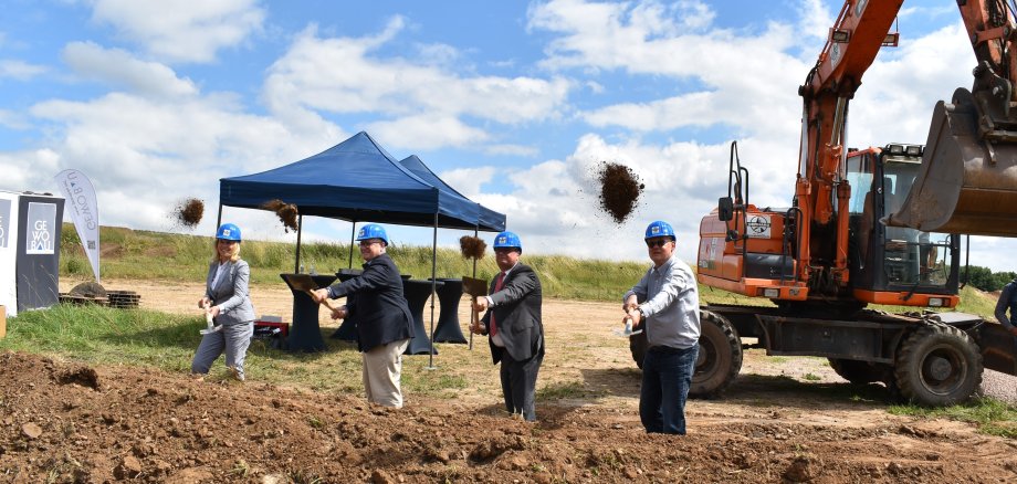 Foto: OB Dr. Heike Kaster-Meurer (links) und Gewobau-Geschäftsführer Karl-Heinz Seeger (zweiter von links) beim symbolischen Spatenstich am Dienstag in den Weingärten.