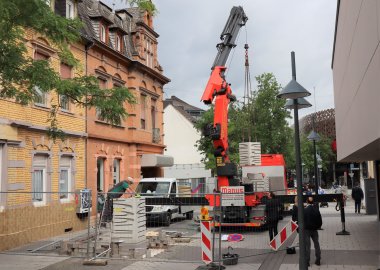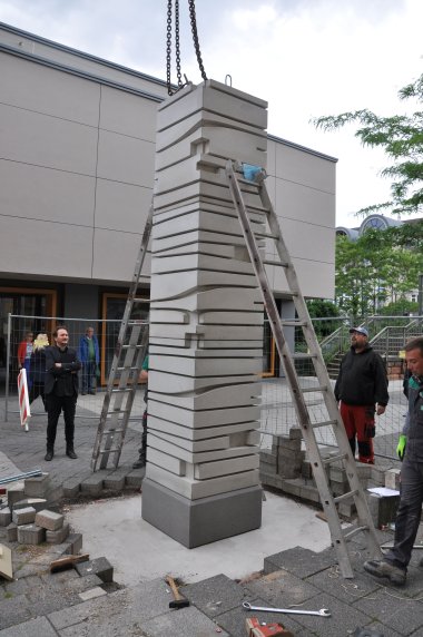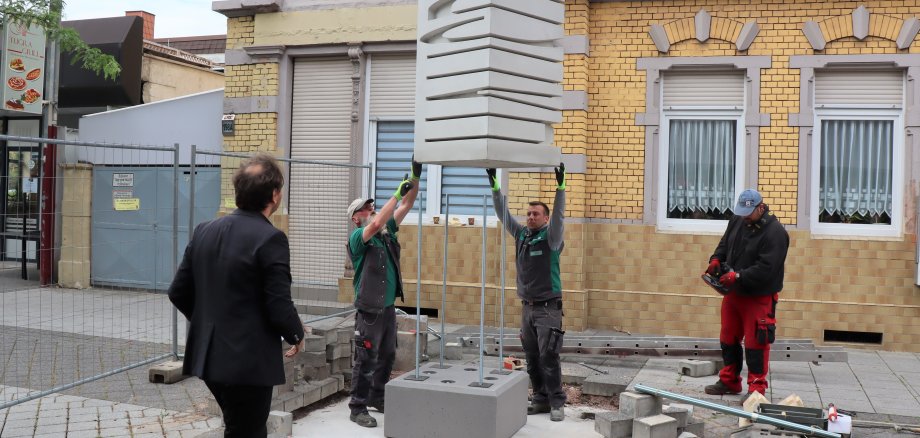 Großes Foto: Künstler Levent Kunt (schwarz gekleidet) mit Mitarbeitern der Betonmanufaktur Kleemann am Freitagmorgen bei der Montage der Stele.