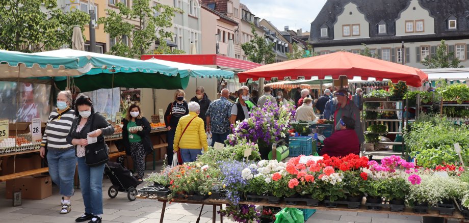 Foto: Der Wochenmarkt auf dem Kornmarkt in Corona-Zeiten.