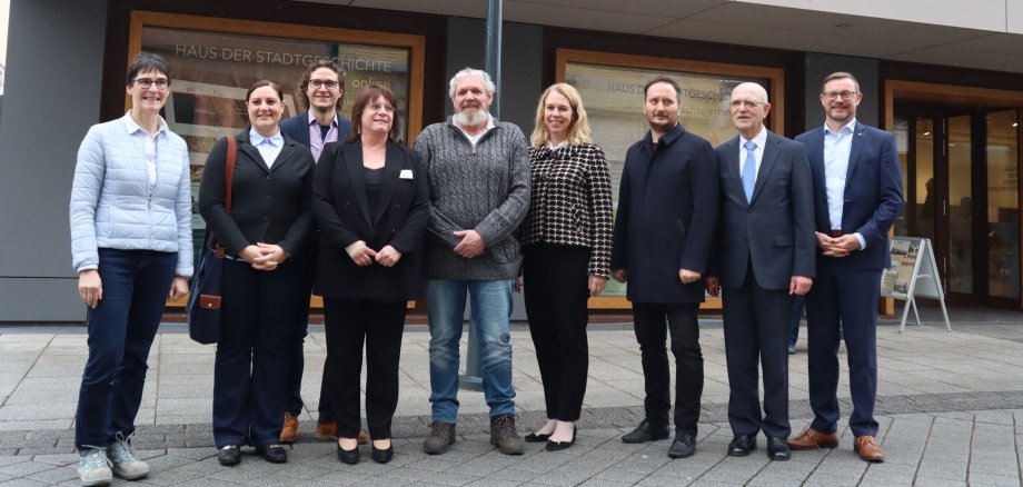 Gruppenfoto ganz oben: Die Hauptakteure vor dem Haus der Stadtgeschichte, v.l.: Elisabeth van Werden-Troll (Stiftung Haus der Stadtgeschichte), Marcelle Mahfoud und Fabian Rieth (Architekten PlanFormArt), Franziska Blum-Gabelmann (Leiterin Haus der Stadtgeschichte), Bernd Frenger (Bauleiter, Abteilung Hochbau und Gebäudewirtschaft), Oberbürgermeisterin Dr. Heike Kaster-Meurer, Levent Kunt (Künstler der Betonskulptur „Kunst am Bau“), Werner Fuchs und Georg Böcking (Förderverein Bürgerarchiv im Haus der Stadtgeschichte).