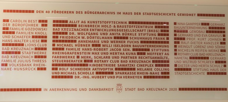 Das Haus der Stadtgeschichte wurde erst das Land Rheinland-Pfalz, das die Baukosten in Höhe von rund 3 Millionen Euro zu 90 Prozent förderte, sowie durch zahlreiche Spender und Sponsoren ermöglicht. 305.000 Euro brachte der Förderverein „Bürgerarchiv im Haus der Stadtgeschichte“ seit seiner Gründung ein und übertraf damit sein selbstgestecktes Spendenziel. „Ohne die engagierte und erfolgreiche Arbeit des Fördervereins wäre ein Bürgerarchiv in dieser Form nicht möglich gewesen“, richteten Oberbürgermeisterin und Stadtarchivarin ihren Dank an die Vorstandsmitglieder Werner Fuchs, Georg Böcking, Birgit Kossmann, Cyrill Reiniger und Gerhard Schläfer sowie an alle Spender und Sponsoren aus.