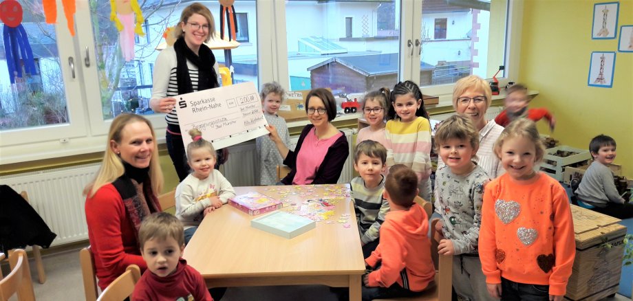 Foto: Die Vorsitzende des Elternausschusses der Kita Kunterbunt, Nicole Dingeldein-Praß (mit Scheck), überreicht Stadtteilkoordinatorin Marlene Jänsch (Mitte) den Spendenscheck. Rechts Kita-Leiterin Gertrud Winter.