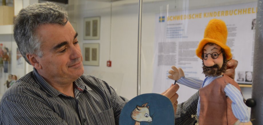 Foto: PuK-Leiter Markus Dorner mit Petersson, einer der schwedischen Kultfiguren, die jetzt das Figurentheatermuseum bevölkern. Foto: Harald Gebhardt, Oeffentlicher Anzeiger