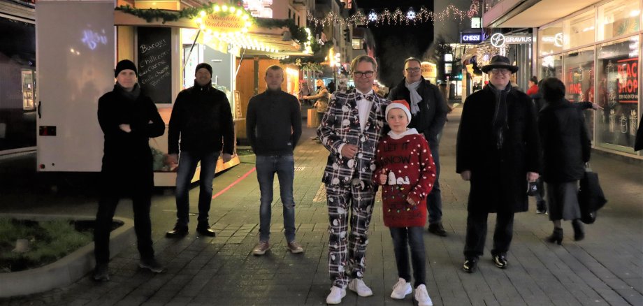 Foto: Freuen sich, dass auch 2020 die Innenstadt in weihnachtlichem Flair erstrahlt, v. l.: Wirtschaftsdezernent Markus Schlosser, Bauhof-Mitarbeiter Andreas Foos und Julian Grams, Stadtwerke-Geschäftsführer Christoph Nath (mit Sohn), Dirk Alsentzer, Erster Vorsitzender von Pro City, und Gewobau-Geschäftsführer Karl-Heinz Seeger.