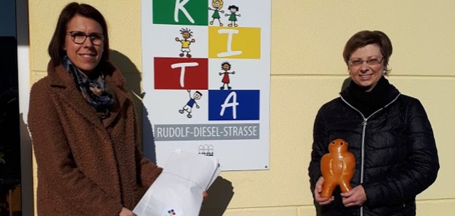 Foto: Symbolische Übergabe der Weckmännchen für die Kitas im Stadtteil Süd-Ost durch Claudia Eider an Silke Behrend, Leiterin der Kita Rudolf-Diesel-Straße.