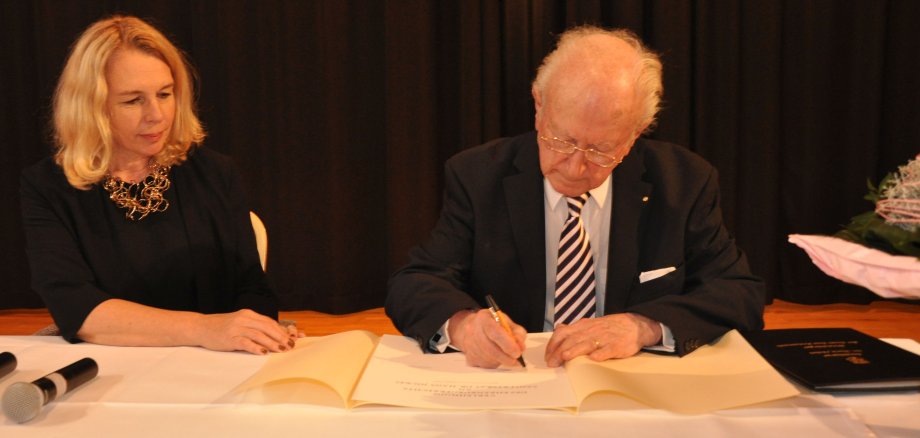 Foto oben: Das Blatt mit der Unterschrift des neuen Ehrenbürgers, der Oberbürgermeisterin und der Vorsitzenden der Stadtrasfraktionen wird in das neue Gäste-Ehrenbuch der Stadt übernommen.