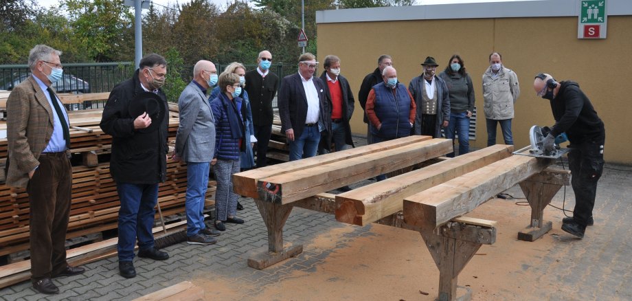Foto: Mit der Kreissäge bearbeitete Ralf Ewert die Pfosten für die Andre-Beitner-Hütte. Über den Stand der Arbeiten informierten sich Sponsoren und Mitglieder der Projektgruppe, bei denen sich Oberbürgermeisterin Dr. Heike Kaster-Meurer herzlich bedankte (von links): Clemens Traumann (Barbara-und Rudi-Müller-Stiftung), Clemens Bergmann, Werner und Annemarie Fuchs, Dr. Heike Kaster-Meurer, Hans-Anton-Finkenauer (Lionsclub), Ralf-Dieter Kanzler Oliver Holste, Karl-Heinz Förster, Clemens Budde, Bruno Eder, Simone Schwenk und Martin Merz (Lebenshilfe). Foto: Hansjörg Rehbein