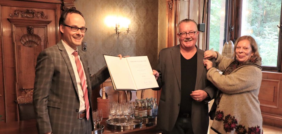 Großes Foto: Staatsekretär Dr. Denis Alt überreichte Steffen Kaul die Urkunde, dessen Partnerin steckte wegen der gebotenen Anstandsregeln die Ehrennadel an. Fotos: Stadtverwaltung Bad Kreuznach