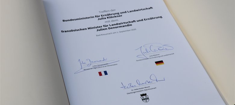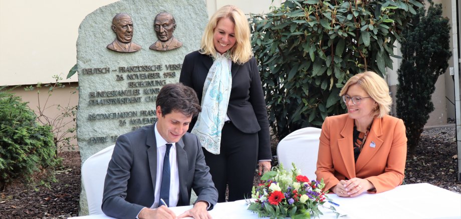 „Wir freuen uns sehr, dass Sie sich in unser Gästebuch eintragen, bedankte sich Kaster-Meurer bei Julien Denormandie, dem sie als Geschenk einen Nahewein und zwei Bücher über Bad Kreuznach und die deutsch-französischen Beziehungen überreichte. Auch Bundesministerin Julia Klöckner und die Oberbürgermeisterin unterzeichneten. Der feierliche Eintrag fand am Gedenkstein vor dem Kurhaus statt, der an das erste Treffen von Bundeskanzler Konrad Adenauer und Frankreichs Präsident Charles de Gaulle nach dem Zweiten Weltkrieg im Jahr 1958 erinnert. Damals wurde in Bad Kreuznach das Fundament für die deutsch-französische Freundschaft gelegt.