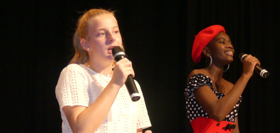 Großes Foto: Die Wettbewerbssiegerinnen Amelie Auweiler (links) und Hadassa Okaibe begeisterten mit einem spontanen Duett. Foto: Jens Fink, Oeffentlicher Anzeiger