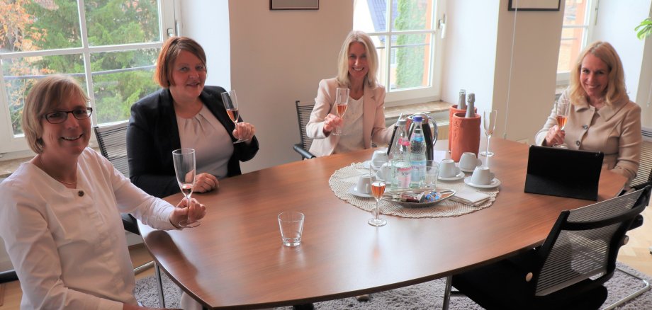 Foto ganz oben: Stießen per Videokonferenz auf das 30-jährige Jubiläum mit Neuruppin an, v. l.: Renate Ziegler, Vorsitzende der Kunstwerkstatt, Kulturamtsleiterin Grit Gigga, Christine Simmich, Koordinatorin für Städtepartnerschaften, und OB Dr. Heike Kaster-Meurer.