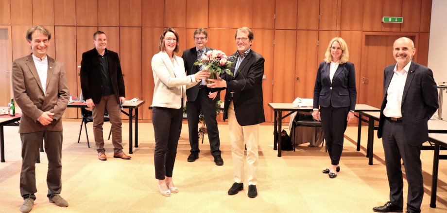 Foto: Freuen sich über die Besetzung der Stiftungsprofessur durch Dr. Kerstin Troidl (Mitte), v. l.: Prof. Dr. Maik Lehmann (bisheriger Studiengangleiter), Andreas Steeg (Wirtschaftsförderer des Landkreises), Prof. Dr.-Ing. Peter Leiß (Vizepräsident Studium und Lehre), Peter Scholten (Vorstandsvorsitzender Sparkasse Rhein-Nahe), OB Dr. Heike Kaster-Meurer und Prof. Dr.-Ing. Klaus Becker (Präsident TH Bingen).