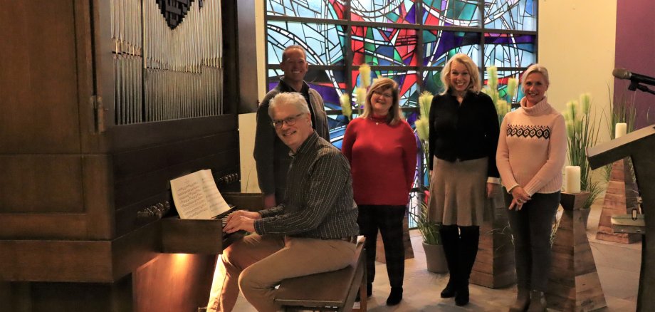 Foto: Klaus Evers (Past-Präsident und Dekanatskantor, an der Orgel) mit (v. l.) Markus Foos (Friedhofsverwaltung), Daria Schmitt (Präsidentin Rotary-Club Bad Kreuznach), OB Dr. Heike-Kaster-Meurer und Christine Senft-Witt (Friedhofsverwaltung).