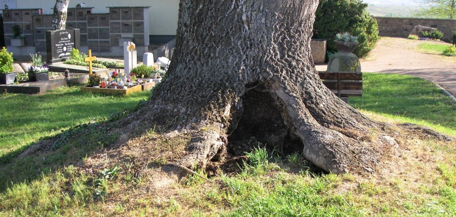 Foto: Beim Betreten des Friedhofs fällt besonders die große Faulstelle am Stammfuß der alten Esche ins Auge.
