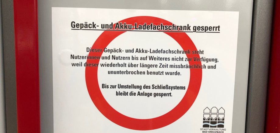 Foto: Ein Schild weist deutlich auf die aktuelle Sperrung der Schließfachanlage in der Rossstraße hin.