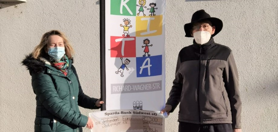 Foto: Silvia Müller, Erzieherin in der städtischen Kita Richard-Wagner-Straße, übergibt Hans Oehler, Erster Vorsitzender Förderverein Bastgässjer, den Spendenscheck.