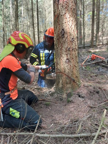 Unter fachkundiger Leitung von Maik Plaines, Beamter im feuerwehrtechnischen Dienst der Berufsfeuerwehr Mainz, sowie den freiwilligen Feuerwehrmann Kai Hofmann, übten die Teilnehmer den sicheren Umgang mit der Motorsäge. Beide haben eine Ausbildung zum Forstwirt im Forstamt Soonwald absolviert und sind daher im Umgang mit dem gefährlichen Arbeitsgerät Motorsäge bestens vertraut. Schwerpunkt der besonderen Übung war an diesem Tag, sogenannte „Problembäume“ in einer Notsituation sicher zu Fall zu bringen, bzw. einen besonderen Gefährdungsmoment mit Bäumen zu entschärfen.