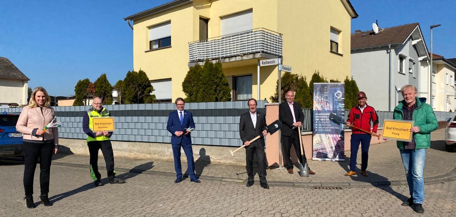 Foto, v.l.: OB Dr. Heike Kaster-Meurer, Dr. Volker Hertel (Ortsvorsteher Bosenheim), Christoph Nath (Geschäftsführer Kreuznacher Stadtwerke), Klaus-Dieter Dreesbach (stellvertretende Geschäftsführer Kreuznacher Stadtwerke), Roland Kieser (Ingenieurbüro Geodata), Albert Knodel (Ingenieurbüro Knodel), Dirk Gaul-Roßkopf (Ortsvorsteher Planig).