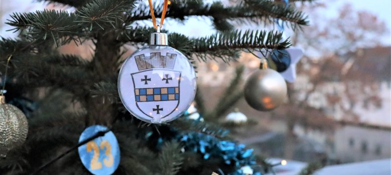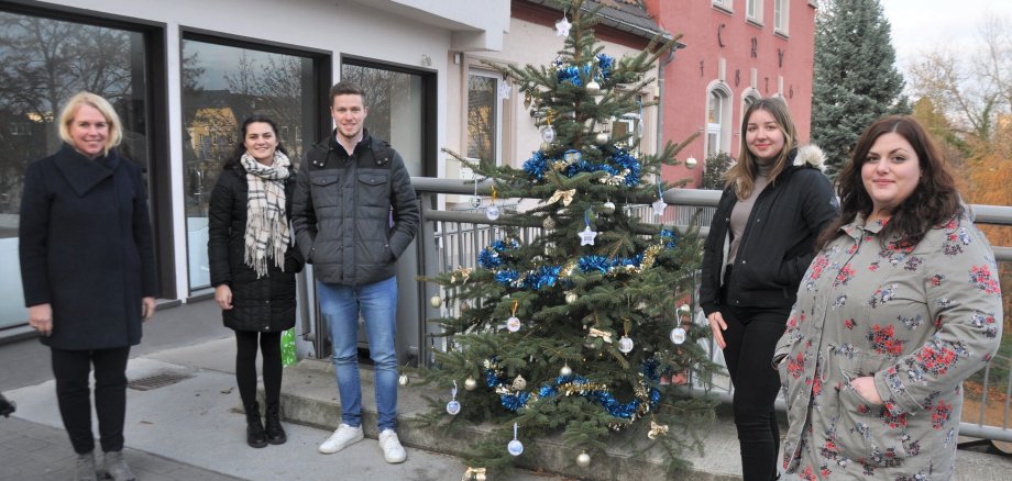 Oberbürgermeisterin Dr. Heike Kaster-Meurer zeigte sich begeistert. Die Azubis haben in die durchsichtigen Baumkugeln Motive aus Bad Kreuznach gelegt: Unter anderem das lustige Brückenhaus für den Jahrmarkt, das Stadtlogo und das Stadtwappen, spielende Kinder, die die Zukunft der Stadt symbolisieren, und den „Blauen Klaus“. Kaster-Meurer bedankte sich bei den Azubis Anika Theobald, Melissa Mayenfels, Lea-Sophie Krüger und Jonas Lamb, Jugend- und Auszubildendenvertretung im Personalrat.